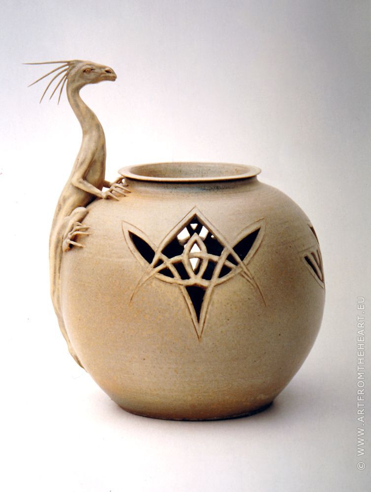 Door de jaren heen is er heel wat drakenenergie via mijn handen de steengoedklei ingestroomd. Grote en kleine draken, maar ook hagedissen, leguanen en door mij zo genoemde 'dragedissen' kregen zo hun vorm. De meeste verwerkte ik op een gedraaide of handgemaakte basisvorm.